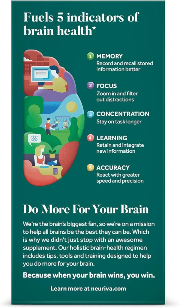 FUELS 5 INDICATORS OF BRAIN PERFORMANCE: The clinically proven ingredients of Neuriva support 5 different indicators of brain performance: focus, memory, learning, accuracy and concentration.